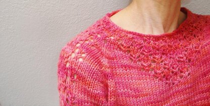 This relaxed and loose pullover is worked from the top down seamlessly. The lace at the neckline flows to the sleeves and the front sections continuously as you work raglan seams( I really, really, REALLY like this part!!). It also appears on each side of the body to give a breezy and elegant look, and a body a slight A-line shape.
