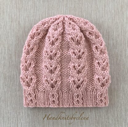 The pretty design on this hat is created with simple cables and twisted stitches. The hat is very easy to knit. The pattern has both written instructions and charts for the stitches used.