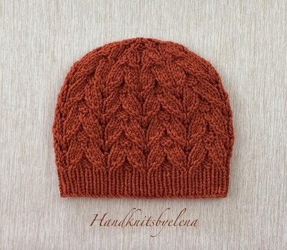 The beautiful design on this hat is created with simple cables and yarn over sts.