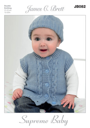 Hat, Mittens, Cardigan and Waistcoat in James C. Brett Supreme Baby DK - JB082 is a Knitting pattern by James C. Brett, available as a Leaflet and includes instructions in English. Super fun to make, this pattern could be your next masterpiece!