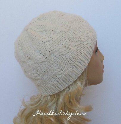 The hat is made in a medium worsted (aran, 10 ply) yarn with gauge of 4 sts per 1" in stockinette stitch.