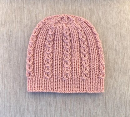 This pretty hat is knitted in a simple stitch with eyelet mock cables. The pattern includes pictures illustrating the technique used to make the mock cables.