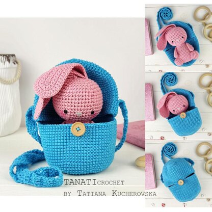 Material: • yarn YarnArt Jeans or ALIZE cotton gold (55% cotton / 45% acrylic) • hook 2.0 mm • soft stuffing • scissors • pink blush • gray thread for the nose • 2 black safety eyes 6 mm • 1 button for the bag • pins for sewing the parts at the right spot • needle for sewing