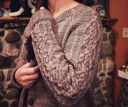 The Hauberk cardigan takes the traditional cardigan and infuses it with strong cables and seed stitches (like the chain mail) making the sleeves the emphasis of the sweater. This cardigan is knit bottom up beginning with the sleeves, then the body using worsted weight yarn. The simple but elegant design uses raglan shaping along the yoke and extra long cable infused sleeves, making it super cozy and enjoyable. There are optional short row sections along the neck and back to give this cardigan a well tailored look. The neck ribbing and button band are picked up and worked last and finished off with classic wooden buttons. This pattern can easily be adapted to fit any length body or sleeve. The original pattern is worked using Malabrigo Rios in the color Wholegrain. Cable pattern is worked in chart only.