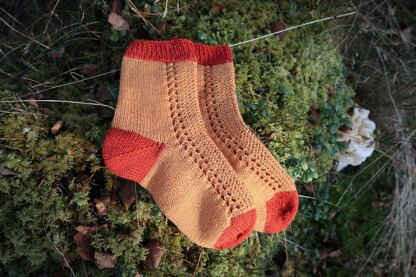 The Haunted Hayride socks are inspired by autumn and Halloween. These top-down socks feature a slip stitch pattern between two small identical lace panels. The stitch pattern across the front of the leg and on top of the foot gives the socks a nice amount of texture, which is perfect for making solid coloured skeins of sock yarn just a bit more interesting. These socks are the perfect companions for those autumn days when the leaves are falling and you’re drinking a pumpkin spice latte before getting started on your Halloween decorating party.