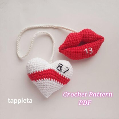 Crochet Heart and Red lips Crochet Pattern PDF. A wonderful crocheted project as a symbol of love by Taylor and Travis ! This cute crochet hanging is the perfect small gift for Taylor fans, Birthday, Christmas, Valentines day or any occations. It can be used as a keychain, backpack charm, a bag accessory or rear view mirror car charm. Size approximately Heart 3” x 2 1/3”(8 x 6 cm.), Lips 3” x 2" (8 x 5 cm.). This pattern is suitable for those who have crochet skills for Intermediate and know the magic ring, single crochet, increase, decrease and also basic sewing and embroidery techniques. Pattern is in standard American terms. Skill level - Intermediate. You will need: - cotton or cotton blend yarn ( YarnArt Jeans) - hook B (2 mm.) - fiberfill - scissors, needle You are free to sell the finished item made from this pattern. PATTERN CAN"T BE SOLD!!! Happy crocheting!!! tappleta