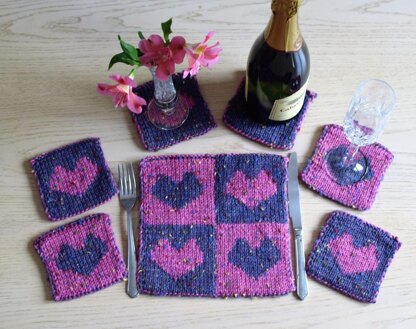 A quick and useful knitting project to make - unique Heart Coasters and Table Mat.