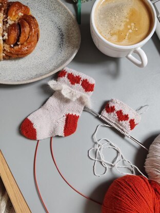 These sweet socks are knit from the cuff down, beginning with a folded cuff adorned with stranded heart colorwork for a charming touch. The design features a reinforced flap heel and playful contrasting toes. To complete the look, an optional lace ruffle adds an extra bit of elegance to these cozy socks. Perfect for tiny feet, these socks combine practicality and cuteness in every stitch.
