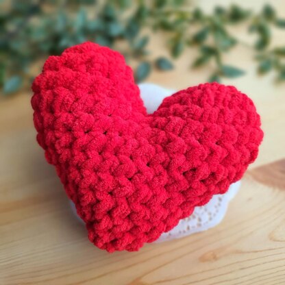 PDF pattern for crochet heart plushie, great valentines gift or home decor. The pattern includes step by step instruction with pictures. the pattern uses velvet super bulky yarn (Size 6) and 8mm crochet hook