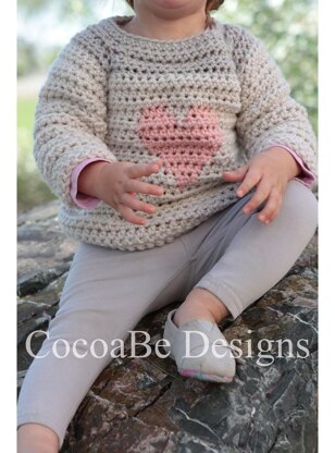 The pattern includes written instructions, heart charts, walk-through pictures, and pictures of the garment. Medium weight yarn is used for the sweater, creating a light-weight but warm gesture of love.