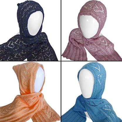 The basic pattern (shown in blue) features a hooded scarf with vertical panels of eyelets, lace hearts and stockinette. Some knitters work best from written instructions, others like charts. Both are included for the basic pattern.