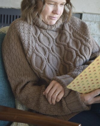 Knit from the bottom up, this raglan sweater is designed with extra long sleeves for maximum coziness. It is made with worsted weight yarn, with a seamless cable design around the body and a beautiful textured stitch for the sleeves. You have the option of making it a turtleneck or a crew neck.