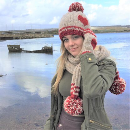 Spread the love with this fun, intermediate knit - hearts and stripes make for style and impact. Fingerless mitts means fingers free for fiddly tasks. Matching hat and scarf for extra warmth on chilly days - all with a heart design.