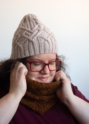 The Heartwood Hat is a deeply-textured & engaging knit, entwined with cables which trace their path from the brim into a ring of knotted hearts, and up into a flowerlike crown. Two sizes are included, each requiring a single skein of DK-weight yarn. The coordinating Heartwood Cowl is available separately, and uses fingering-weight yarn for the perfect balance of drape and squish.