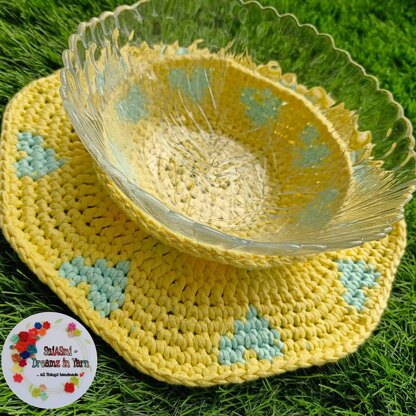 Finished Size: Doily - 12.5 ", Bowl base - 4.5" and Bowl upper width - 7.5" The size of the project mentioned is following given instructions and using Ganga COTTO-NIT yarn: Yarn width approx. 0.5 inch. Yardage 153 yards per 200gm