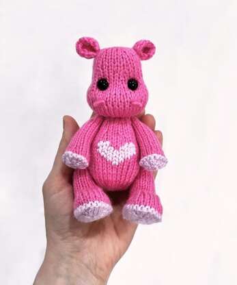 This is a knitting pattern for a Hearty Hippo stuffed toy. The head and ears are knitted flat (back and forth), but the body, legs and arms are knitted in the round on double pointed needles. The small heart on the chest is embroidered after the hippo is finished using a duplicate knit stitch.
