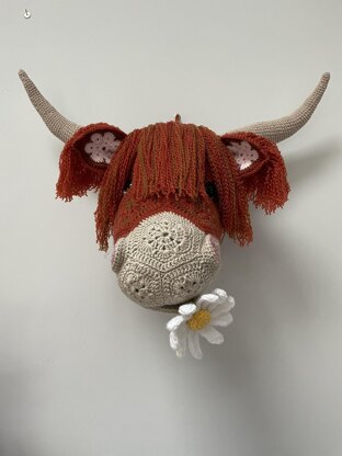 Heather the African Flower Crochet Highland Cow Trophy Head is a Faux Taxidermy wall decoration.
