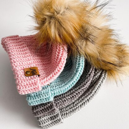 Dazzle your way through Winter with a warm and cozy hat designed to keep you extra snug and fashionable. The interesting herringbone stitch works up thick and squishy. Add a strand of lace mohair for a fuzzy halo. Two brim options included, plus a video tutorial. Pattern includes sizing from baby to adult.
