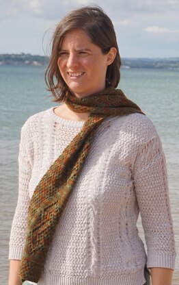The Hebrides are a group of islands off the wild and rocky west coast of Scotland. Fifteen hundred years ago the islands were at the heart of a Celtic society. This scarf takes inspiration from the artwork of this time by repeating one of the simplest Celtic knot designs to represent the chain of islands within a sea of double moss stitch. The knot is worked in lace, using a combination of yarn overs and simple decreases to trace the strands. I invite you to dive in and go on your very own island-hopping adventure.