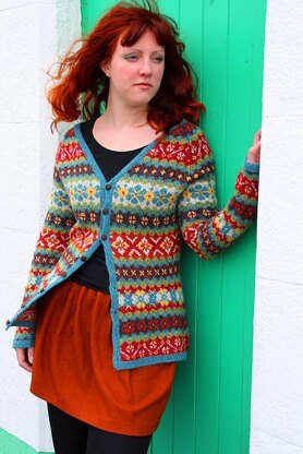 The cardigan is knitted from the bottom up in rounds, with a steek for the front opening. Side shaping and a compound raglan yoke create a flattering fit.