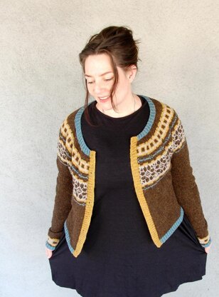 This is a pattern for a top down circular yoked cardigan. Stitches are cast on for the rib neckline (worked flat), then short rows are worked for neck shaping. The neck is joined and yoke chart worked for chosen size. Sleeve stitches are separated from body sts. Underarm stitches are cast on/picked up and each element is worked separately to the edge rib, before bind off.