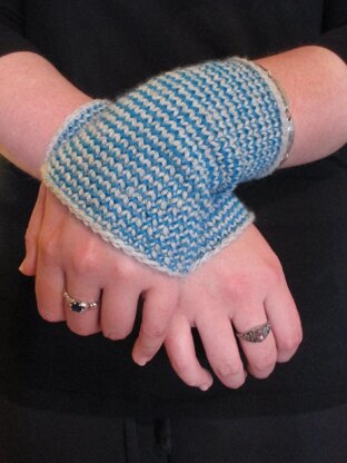 These wristlets are a great first project in helical knitting, a method of knitting in the round that hides the beginning of the round. They are quick and easy to make and require only 5 or so yards of each color of yarn. You can make them literally any size or color and with whatever size needles you want, depending on the size desired.
