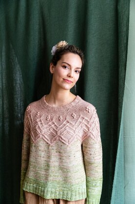 Helleborus is a flower-inspired pullover worked seamlessly top-down. The sweater features a gorgeous cabled yoke made even more stunning by the combination of cables and stranded knitting at the bottom of the yoke. This sweater is worked with fingering weight yarn held double. You could work it in a single strand of DK weight yarn but using two strands of fingering weight opens up a whole lot of possibilities for colour play and fading as you can change one colour at a time while keeping the other fixed. The sweater has long sleeves and no waist shaping. The hem is cropped.