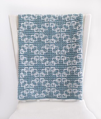 This blanket is made using a mosaic stitch. There are no colour changes within the working rows, the colour pattern is made by slipping the stitches of one colour, while knitting the stitches of the other.