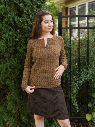 A slim-fitting three-season cable and lace henley in nine sizes. The design features set-in sleeves, jewel neck, center front placket with close-set buttons, and inset body shaping. All pieces are knit flat, bottom up, and seamed. Substituting yarn and/or needles may result in an overall variation in size.