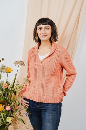 This relaxed shawl-collar sweater is knitted in a soft, silky yarn. Designed with plenty of positive ease for a relaxed fit, and using that soft, draping yarn, this sweater will make a comfortable addition to your wardrobe. Its deep V neckline is finished with a shawl collar, and the fabric is decorated with gansey-inspired knit-and-purl patterning for a textured finish. The designer has used The Fibre Co.'s Luma yarn, a DK-weight which gives a luxurious feel and great stitch definition.