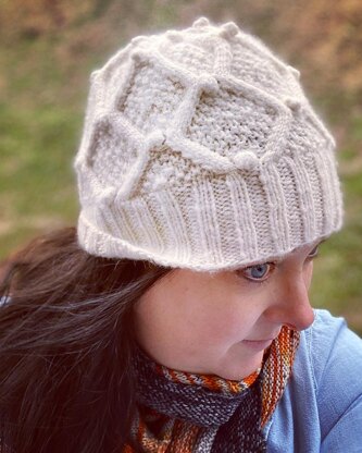 The Heritage Hat is designed with symmetrical diamond shaped cables and accented with traditional seed stitch and whimsical bobbles.