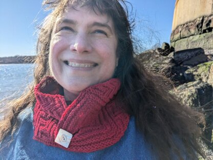 The Herringbone Hexagonal Cowl begins with a center out square of Quaker Welt Stitch worked flat. The two sides around the buttonhole are bound off, then the cowl is finished with Rib and welt Diagonals worked on the bias. The buttonhole is closed with two seams and the cowl is secured with a button, this gives the buttonhole flexibility in case there is a truly huge button waiting for center stage.