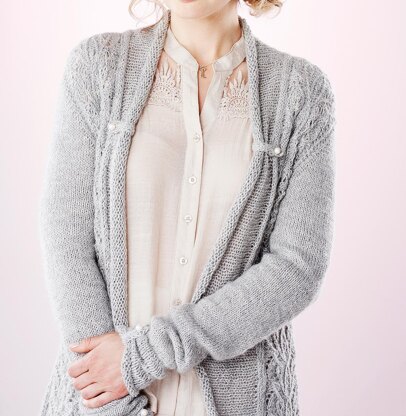 *Originally published in the Knitter Issue 88. * Seamless, graceful, and with a flattering bit of waist shaping, this long-line cardigan is surprisingly fast to knit and elegant to wear. Worked in Sublime's luxurious Superfine Alpaca DK yarn, it has a beautiful lace and cable pattern. The loose, stocking stitch front bands and cuffs are drawn up with buttoned tabs to create soft folds.