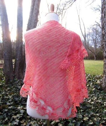 Hestia is the newest Parthenon-inspired wrap. It is a light wrap roughly scalene in shape. It begins with a tiny number of stitches at one side, and gradually increases in length and width. The lotus flower edging is added after the body is completed.