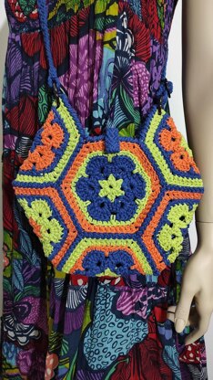 This interesting handbag or purse consists of hexagonal motifs, also known as African flowers. You have a chart, written pattern in English, photo and video tutorials for specific stitches to make this little beauty. **For this project I used:**1. Crochet hook 4.5mm / US 7, plus an auxiliary thinner hook 3,5mm / US 4/E or F for pulling in the ends; 2. Macrame cotton cord 2.5mm (about 0.1 in) in 3 colors; one ball has 250gr/8.80 oz and 225mt/246.06 yds. Notice this: for purse bag you need one-third of a ball of orange and green, and almost all of blue (to join motifs and straps).3. Quality bag’s metal fittings: magnetic closure 18mm (about 0.71 in), rectangle sliding bar strap (adjuster buckle) 2cm (about 0.79 in) for straps, 2 pcs ”O” rings 38mm (about 1.5 in).4. Sewing needle and thread in the appropriate color; scissors.5. some lining fabric ~30x70cm/12x28”.