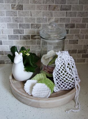 Let's use our crochet skills to make this little spa treat set and reduce unnecessary waste! The face pads are completely reusable, eco friendly and perfect for everyday use. Once they get dirty, toss them in the laundry bag and just throw the whole thing in the wash, so that will stay together in one place. The pattern includes instruction for the full set, including two Round and one Hexagonal pad designs and one adjustable size string mesh laundry bag.