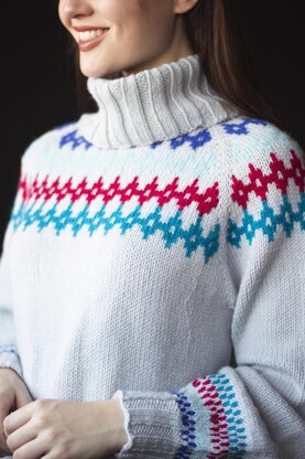 NOTESThis sweater is worked seamlessly from the top down. It begins with a simple ribbed roll neck, followed by a stranded colourwork yoke in between raglan shaping. After dividing for the body and sleeves, the remainder of the body is worked without shaping until the sides split for the hem. Finally, the sleeves are worked in the round from the armholes down, ending with a colourwork cuff which gathers into ribbing.