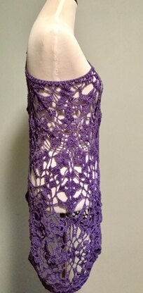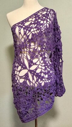 FINISHED DIMENSIONS: Laid flat after blocking, the garment as shown measures approximately 15” wide at the neck and shoulder opening and 16” wide at the drape sleeve opening. The top is about 24” long from shoulder to hem but drapes to about 27” along the long asymmetric edge. It is a “one-size-fits-most” pattern. The motifs are designed to stretch. For a smaller size or more form-fitting top use a 3.5 - 4.0 mm hook, or omit a round of the motif pattern and join the remaining spaces accordingly.