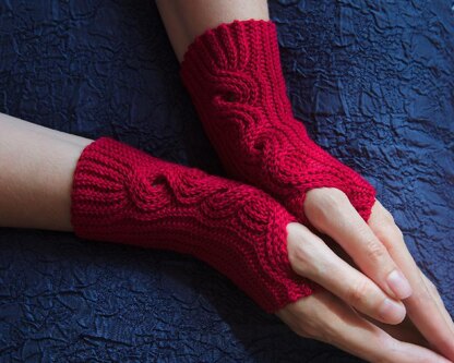 These elegant, fingerless mittens are worked entirely in slip stitches, using the back loop only slip stitch. The cable is worked horizontally - a technique that I invented.