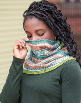 The two main Fair Isle patterns for this design remind me of the Scottish Highlands – providing a hint of tartan and argyle patterning. The double-wrap cowl is knit in the round, from the bottom up, and, as only two colors are used in any round and there are no long floats, it makes for a relatively easy yet interesting project.