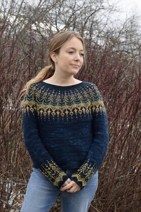 Hinterland is inspired by the northern lights in Norway. This sweater features easy top down and seamless construction, is knit entirely in the round, and options for a rolled or ribbed neckline are included. The cuffs are my favorite part about this design! We knitters often joke about being stuck on sleeve island, but with fun colorwork at the end, it might just motivate you to bang these sleeves out. Fingering or sport weight yarn. Designed to be worn with 3-6” / 7.5-15 cm positive ease. Shown with 4” / 10 cm of positive ease.