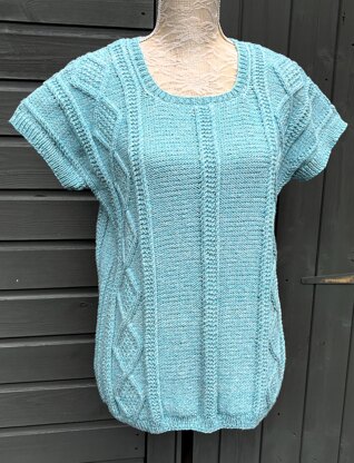 An all-season over-top featuring gently dropped shoulders. Elegant diamond panels are filled with moss stitch and framed on each side by narrow verticals of twisted stitches and slender garter stitch panels. A matching vertical runs down the centre front and back, creating a balanced, flattering silhouette with a nod to classic Aran styling. All edges are finished in simple single rib for a clean, refined look. Worked bottom up and with full written instructions.