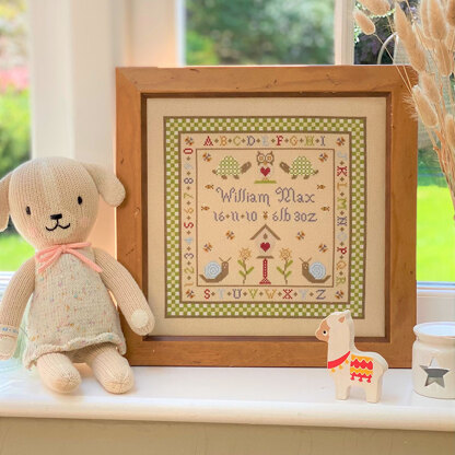 A modern Birth Sampler. he design features colourful snails, tortoises and an owl. Stitched in a bright palette of shades which works really well with our specially dyed Zweigart fabric. We provide enough thread for the name to be stitched in either blue or red.Each cross-stitch kit contains:-