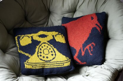 Two cushion covers inspired by two classic Hitchcock films: Dial M for Murder and The Birds. Knit intarsia style, the front of the pillows are knit with a chart, and the reverse of the pillows are knit in two different rectangular-type repeats for extra appeal so you can turn the pillows around depending on your mood. Seaming and adding a zipper at the bottom gives a professional looking finish.