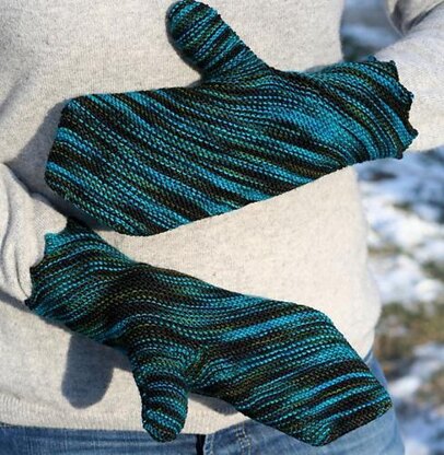 Here are the mittens to match your Hitchhiker scarf and Hitchhat! Unusual biased construction meets nice, cozy garter stitch that looks fabulous in a handdyed fingering-weight yarn and keeps your hands warm, plus a fun sharktooth border at the cuff. The cuff is tighter than the hand due to short-row-shaping, such that the mittens will not come off by themselves. For the symmetry-freaks among you:These mittens are reversible and mirror each other perfectly – because they are actually the same but one is worn inside-out!