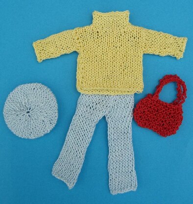 I have designed this easy to knit miniature knitting pattern for the dolls house in 1:12 scale. The finished outfit of cotton trousers and funnel neck sweater will fit a doll of about 6 inches tall in the dolls house.