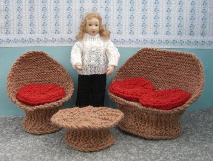 I have designed this easy to knit miniature knitting pattern for the dolls house in 1:12 scale. It produces a complete set of 'cane-effect' furniture suitable for a dolls house conservatory, complete with cushions.