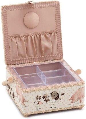 Brighten up any workroom with this 'Farmyard' Sewing Box. Contains colour coordinated plastic inner tray to help organise your smaller sewing accessories.\nInternal colour coordinated satin lining with pin cushion and handy pocket. Convenient and sturdy carry handle. Small - Depth 20cm x Width 20cm x Height 11cm