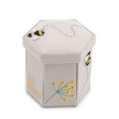 Adorable hexagon shaped padded sewing kit with bee and flower embellishments. The design allows to box to fully open once the lid is removed, revealing 6 sides containing storage pockets and central pin cushion. Covered in beige linen fabric with a coordinating yellow fabric interior. Ideal for beginners or for sewing on the move. Contains: Seam ripper, scissors, 3 needles, 2 plastic head pins, thread card, needle threader and a tape measure.Size: 11 x 11 x 12 cm (4.3 x 4.3 x 4.7 inches).