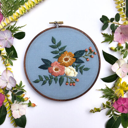 Beginner embroidery kit containing everything needed to learn how to embroider.Digitally printed cotton fabric, an unfinished wooden embroidery hoop, DMC embroidery needle size 5, instruction booklet, and full skeins of DMC embroidery floss.
